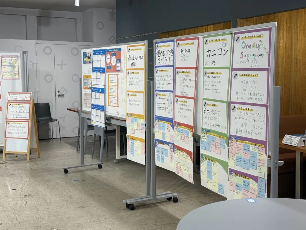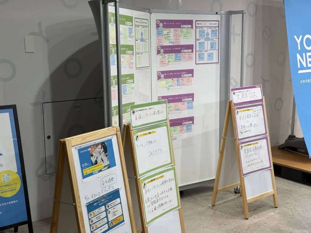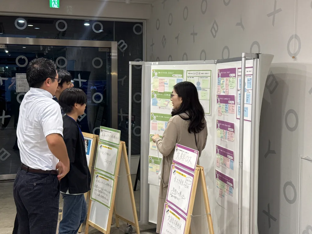 会場には、夏に開催されたYOXO NEXT起業ラボで中高生が実際に取り組んだワークシートを展示し、どんな困りごとから、どのような起業アイデアが生まれたのか、思考のプロセスを追体験するようなライブ感を味わっていただきました。