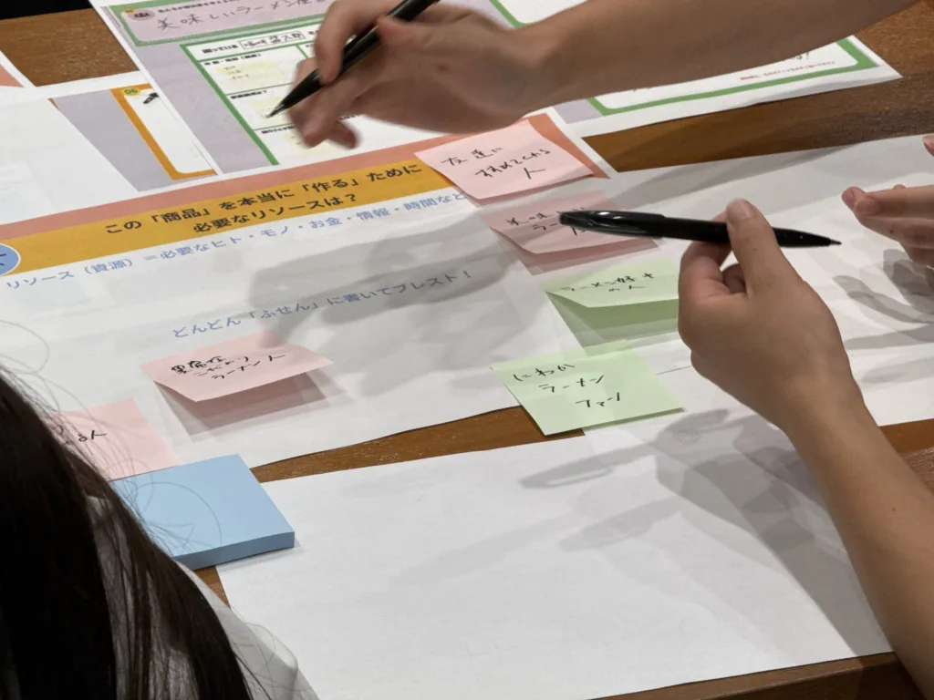 人、時間、お金、知識、仲間、場所など、どのようなリソース(資源)があれば事業が前に進むのかをチームで考えました。